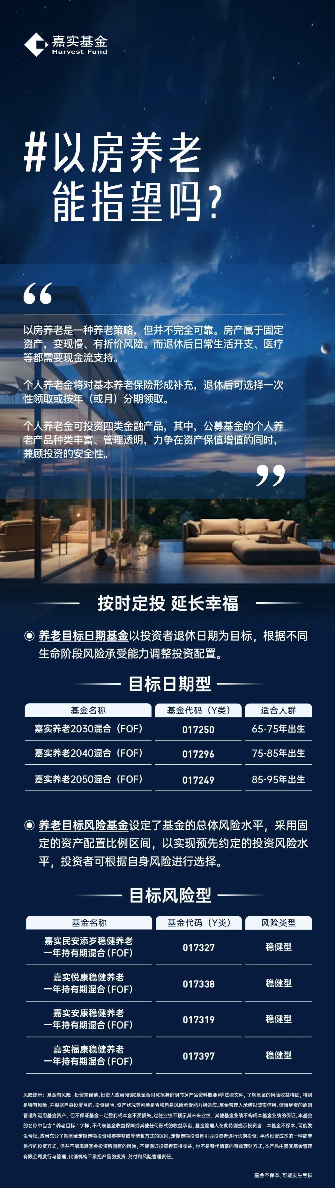 *風險提示:基金投資需謹慎,投資人應當閱讀《基金合同》、《招募說明書》、《產品資料概要》等法律文件,了解基金的風險收益特征,特別是特有風險,并根據自身的投資目的、投資經驗、資產狀況等判斷是否和自身風險承受能力相適應。基金管理人承諾以誠實信用、謹慎盡責的原則管理和運用基金資產,但不保證基金一定盈利或本金不受損失。過往業績不預示其未來業績,其他基金的業績也不構成本基金業績的保證。個人養老金可投公募基金范圍具體以中國證監會確定的產品名錄為準。“養老”字樣不代表收益保障或任何形式的收益承諾,個人養老金基金不保本,可能發生虧損。不同產品的風險收益特征可能不同,投資人應根據自身年齡、退休日期、收入水平和風險偏好等選擇合適的養老金基金。