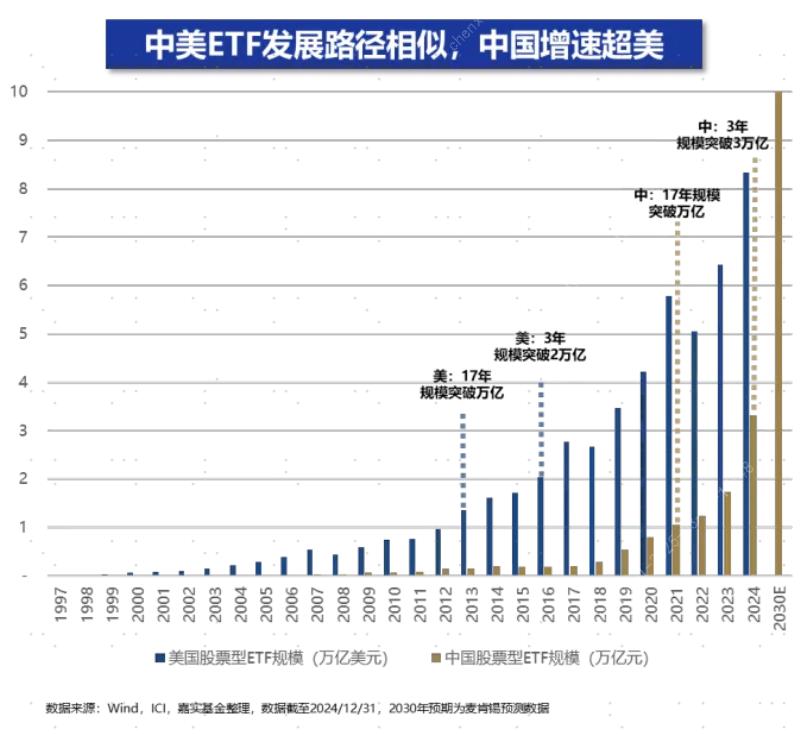 以權(quán)益類ETF為例,美國(guó)市場(chǎng)用17年突破萬億規(guī)模,又用了3年破第二個(gè)萬億,截至2024年末,美國(guó)ETF市場(chǎng)規(guī)模高達(dá)8萬億美元。中國(guó)市場(chǎng)同樣用17年實(shí)現(xiàn)首個(gè)萬億,但僅用3年便突破三萬億,增速遠(yuǎn)超美國(guó),發(fā)展勢(shì)頭迅猛,背后是多重因素合力推動(dòng)。
