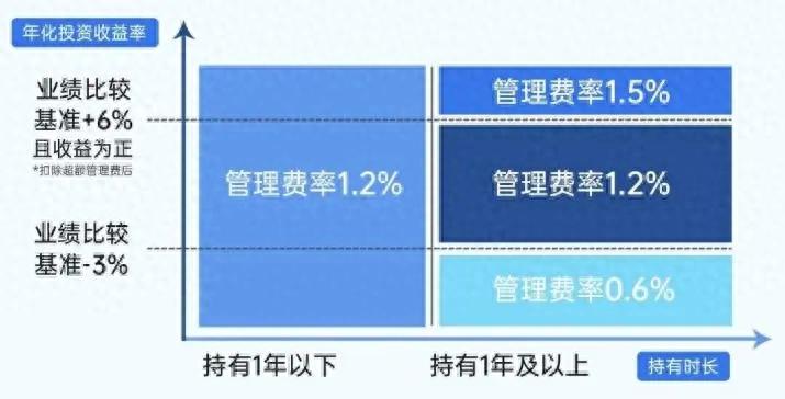 (注:具體費率標準以基金合同約定及實際情況為準。持有期限不足一年(即365天,下同),則按1.20%年費率收取管理費;持有期限達到一年及以上,則根據持有期間年化收益率分為以下三種情況,分別確定對應的管理費率檔位:若持有期間相對業績比較基準的年化超額收益率(扣除超額管理費后)超過6%且持有收益率(扣除超額管理費后)為正,按1.50%年費率確認管理費;若持有期間的年化超額收益率在-3%及以下,按0.60%年費率確認管理費;其他情形按1.20%年費率確認管理費。)